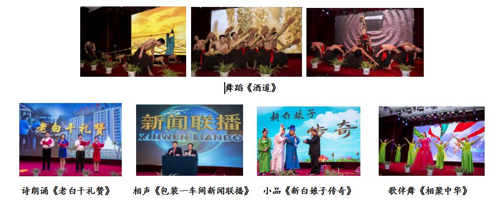 公司舞蹈隊(duì)帶來的舞蹈《酒道》,以逼真的表演將老白干酒文化呈現(xiàn)給觀眾,更把我們老白干精湛的釀酒技藝用肢體語言演繹的惟妙惟肖。詩朗誦《老白干禮贊》,高度贊揚(yáng)了衡水老白干建廠七十周年,一代代老白干人一路走來披荊斬棘,繼承傳統(tǒng)、開拓創(chuàng)新,譜寫成老白干最響亮的贊歌。營(yíng)銷公司崔艷芳、劉康康帶來的小品《新白娘子傳奇》,搞笑滑稽的動(dòng)作,奪人眼球,令觀眾拍手叫好。包裝一車間袁文興、貢愛華帶來的相聲《包裝一車間新聞聯(lián)播》,以幽默的語言,夸張的表情,使現(xiàn)場(chǎng)氣氛異常活躍。最后,技術(shù)中心皮寒玉帶來歌伴舞《相聚中華》,聯(lián)歡會(huì)在最強(qiáng)音的旋律中圓滿結(jié)束。